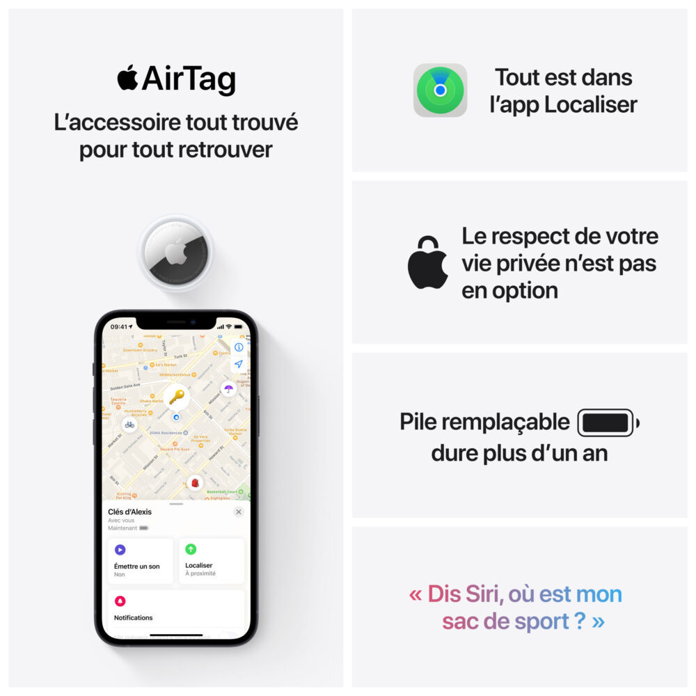 Les AirTags sont le moyen tout trouvé de tout retrouver. Pour les utiliser, c’est très simple : accrochez-en un à vos clés, glissez-en un autre dans votre sac, et n’y pensez plus. Vous pouvez pister vos objets dans l’app Localiser. Avec les AirTags, plus rien ne vous échappe.